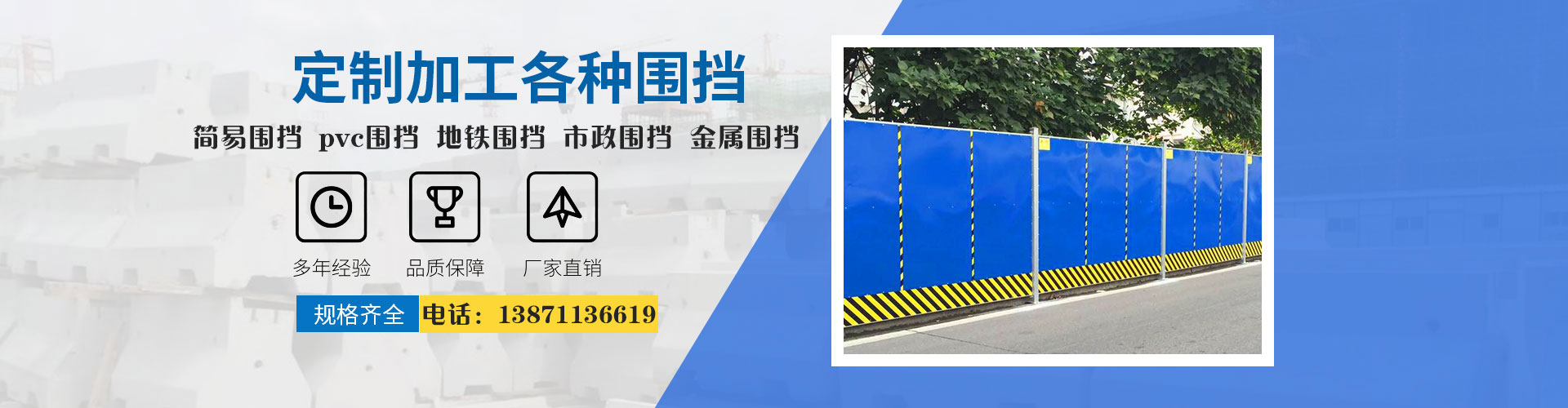 湖北章輝泓宇工程有限公司專注于生產及銷售各類圍擋產品,主要有:簡易圍擋、pvc圍擋、地鐵圍擋、市政圍擋、金屬圍擋、工地圍擋等建材,誠信經營十五年,客戶遍及全國,期待與您真誠合作。